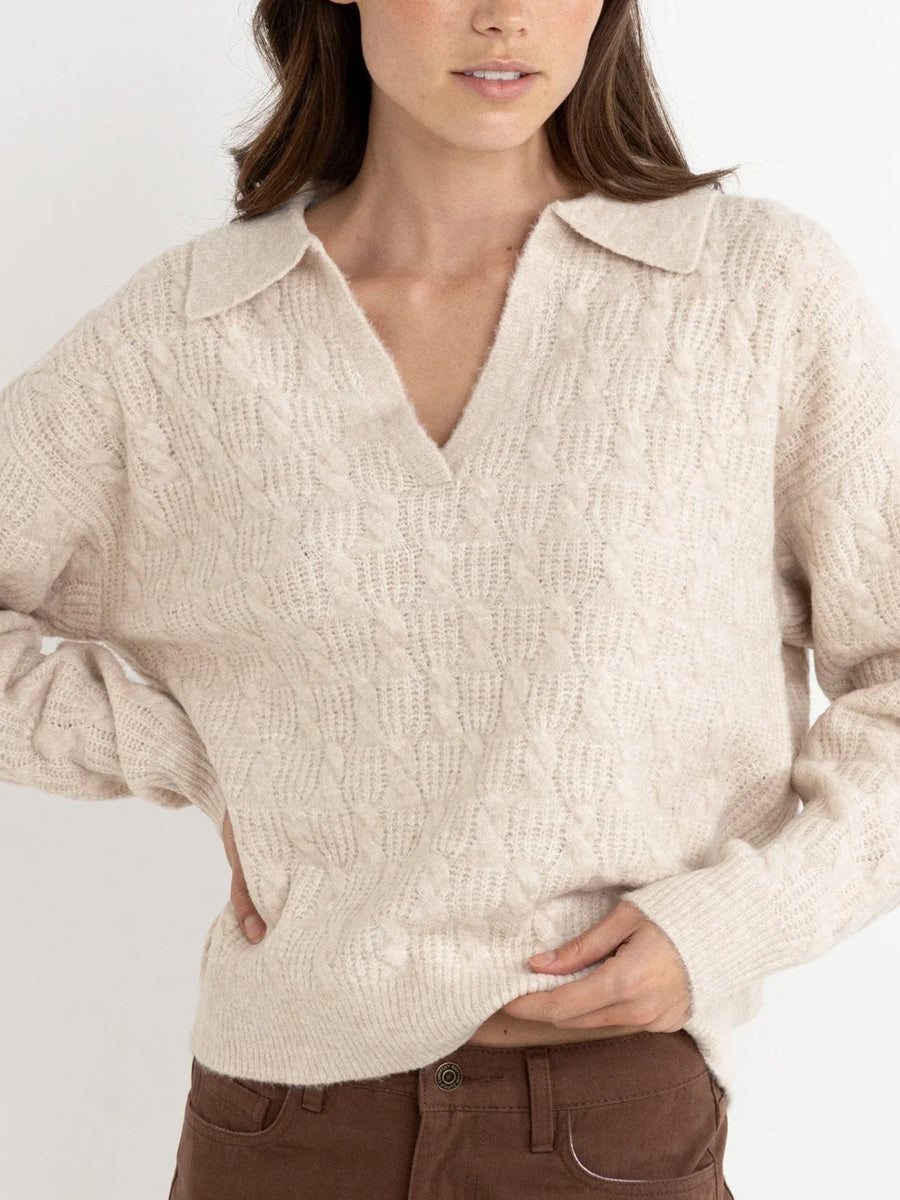 CROPPED COLLARED KNIT SWEATER - LIGHT TAUPE