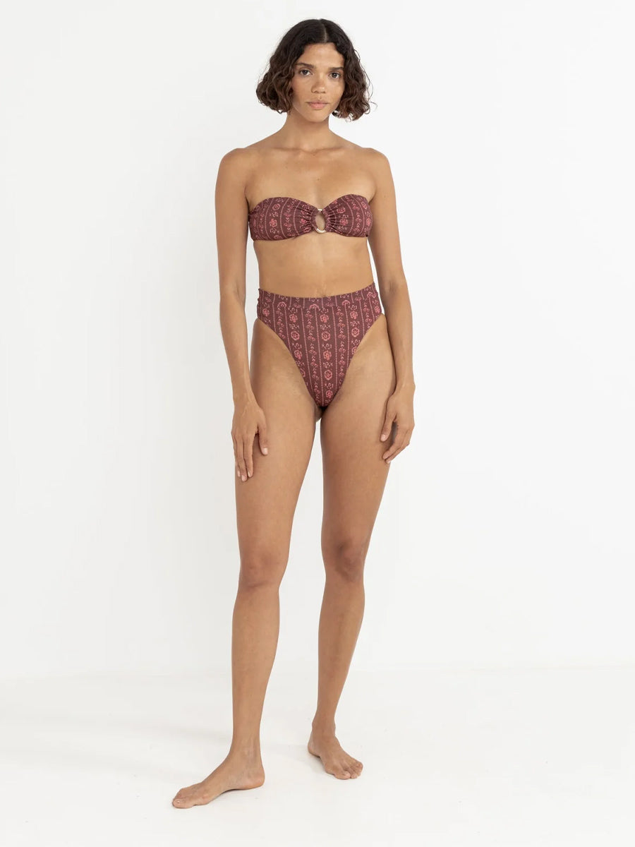 The Vintage Floral Hi Waist Bikini Bottom brings retro charm to poolside lounging. With a flattering fold-over waistband and a dreamy burgundy floral print, it’s made for sun-soaked days and seaside snapshots. Pair with the matching bandeau for full vintage vibes.